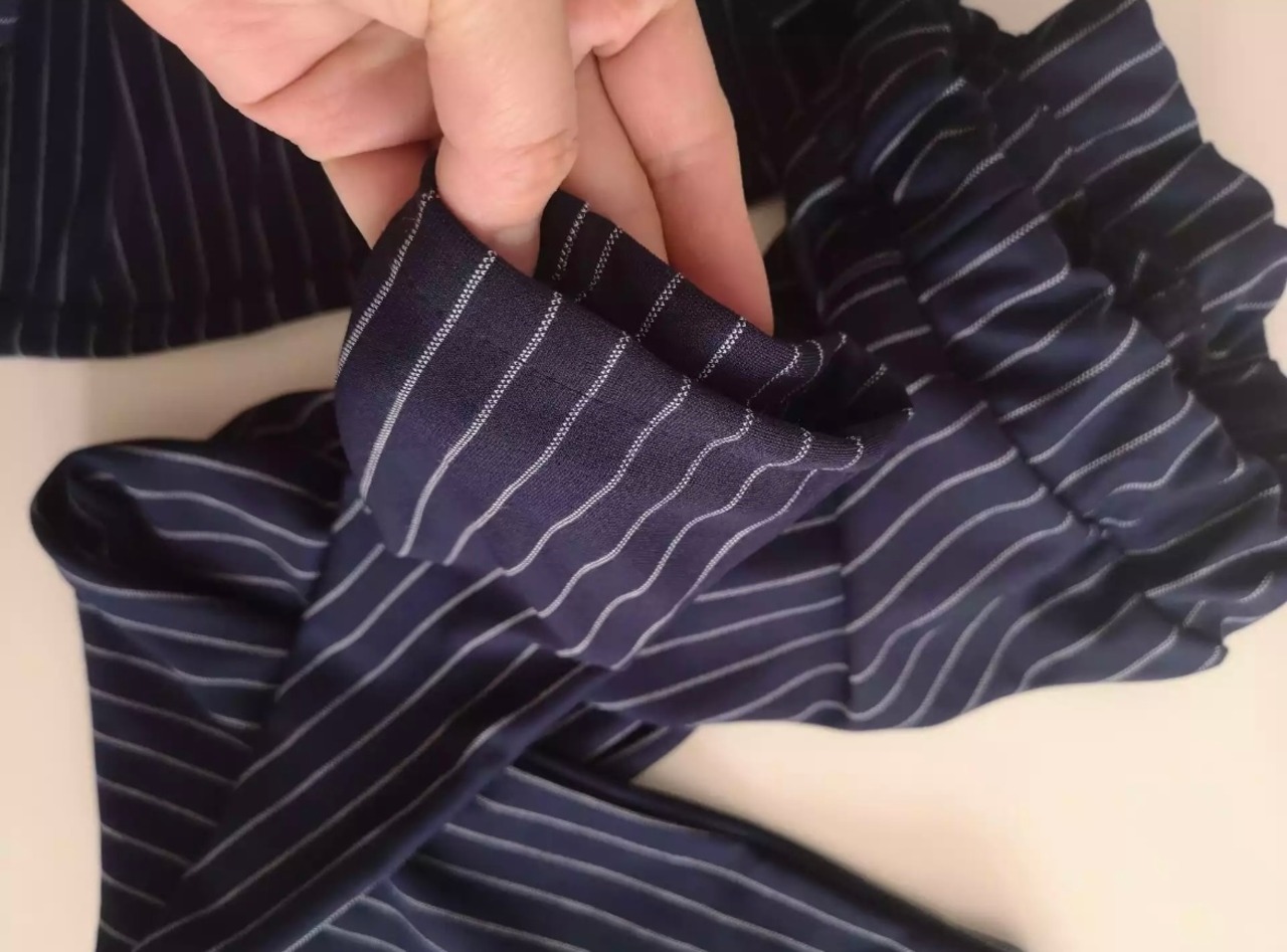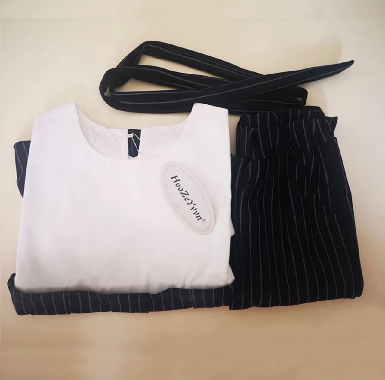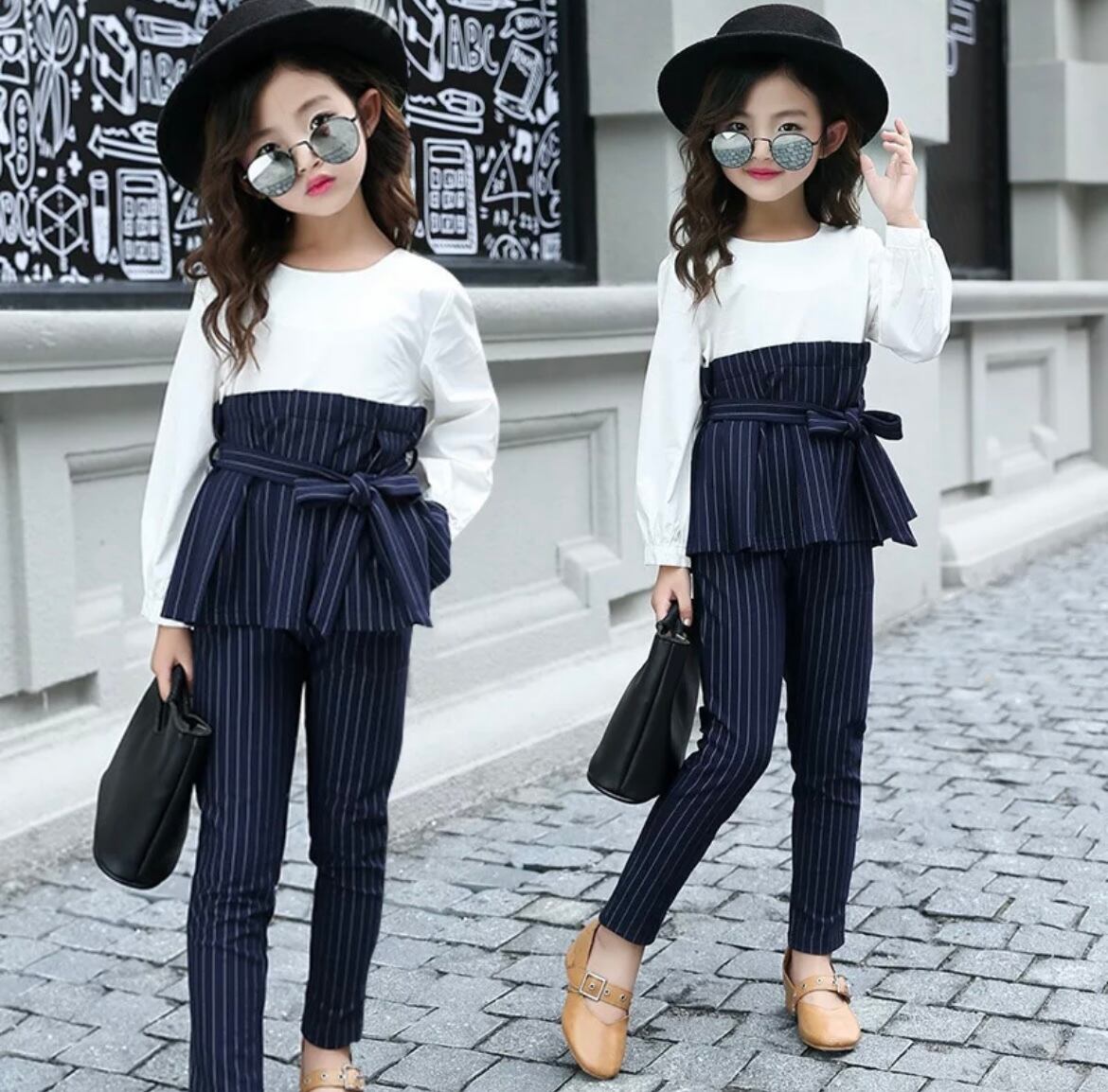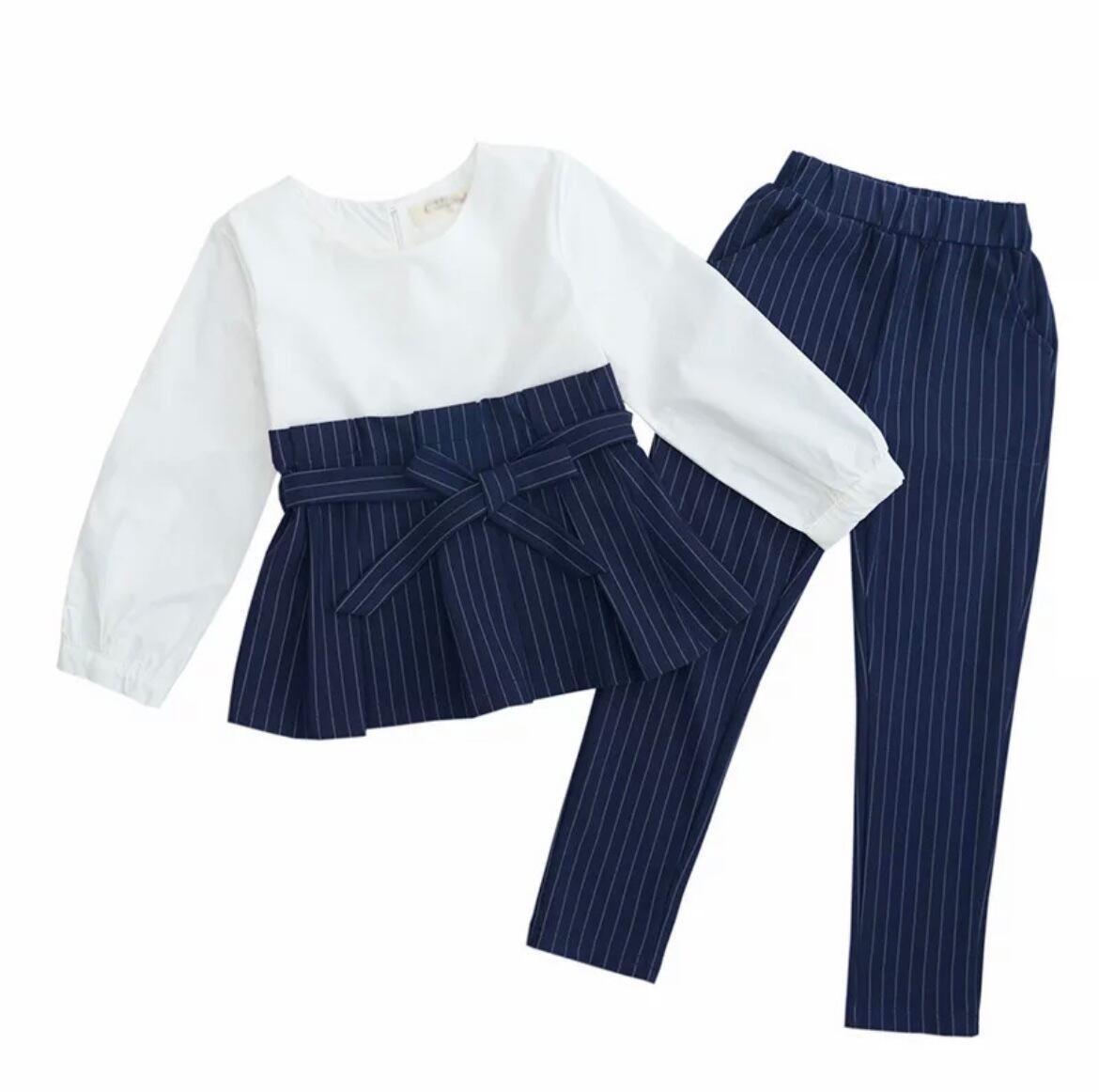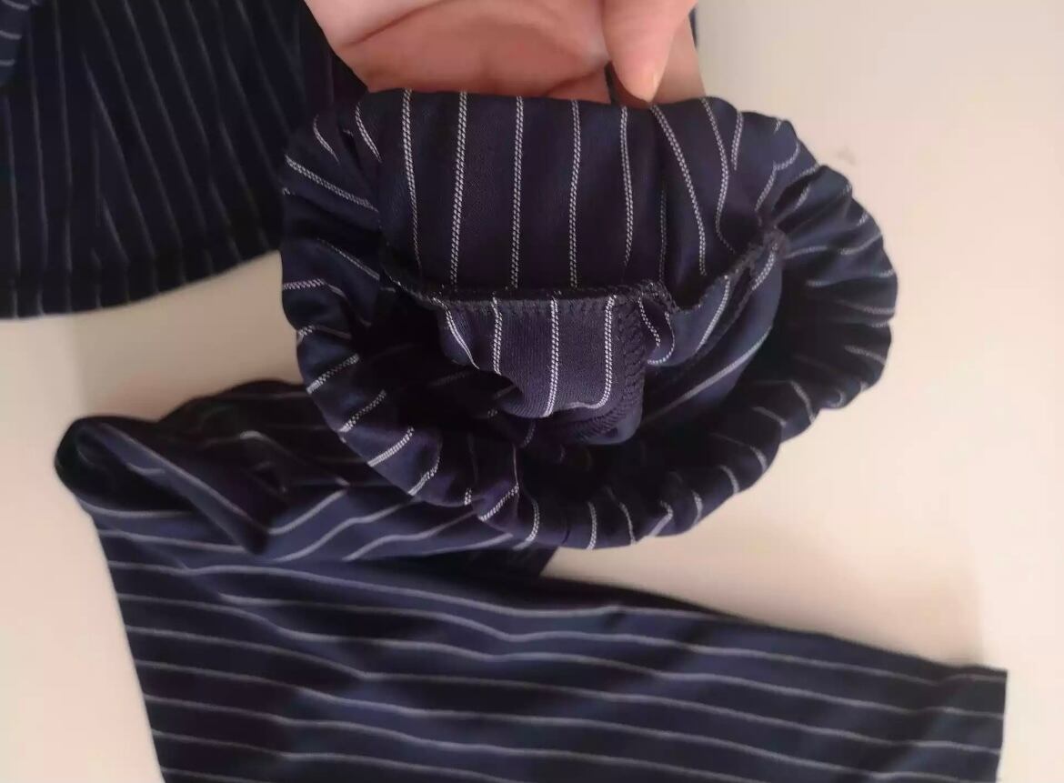 *切り替えトップス、ストライプパンツ